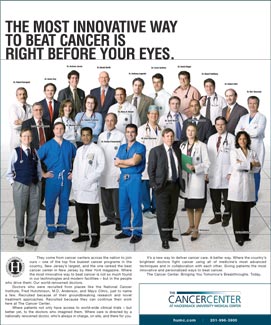 This advertisement positions The Cancer Center at Hackensack University Medical Center as a leader in developing and delivering novel cancer treatments. The visual supports and expands upon this message – signifying that there is a full team of experts on site ready to serve.